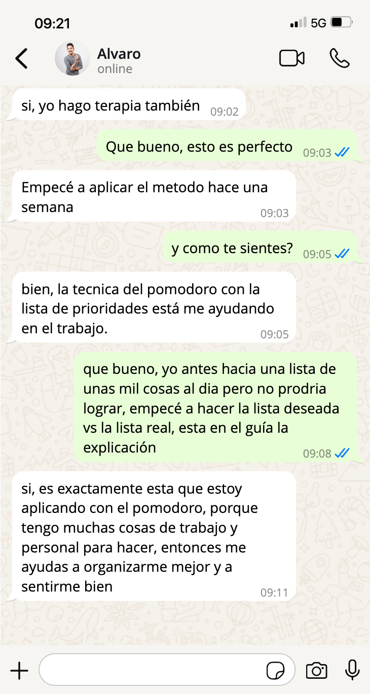 El contenido de este método se fundamenta en mis vivencias y aprendizajes personales, incluyendo insights de terapias psicológicas, psicoanálisis y coaching de productividad que he experimentado.